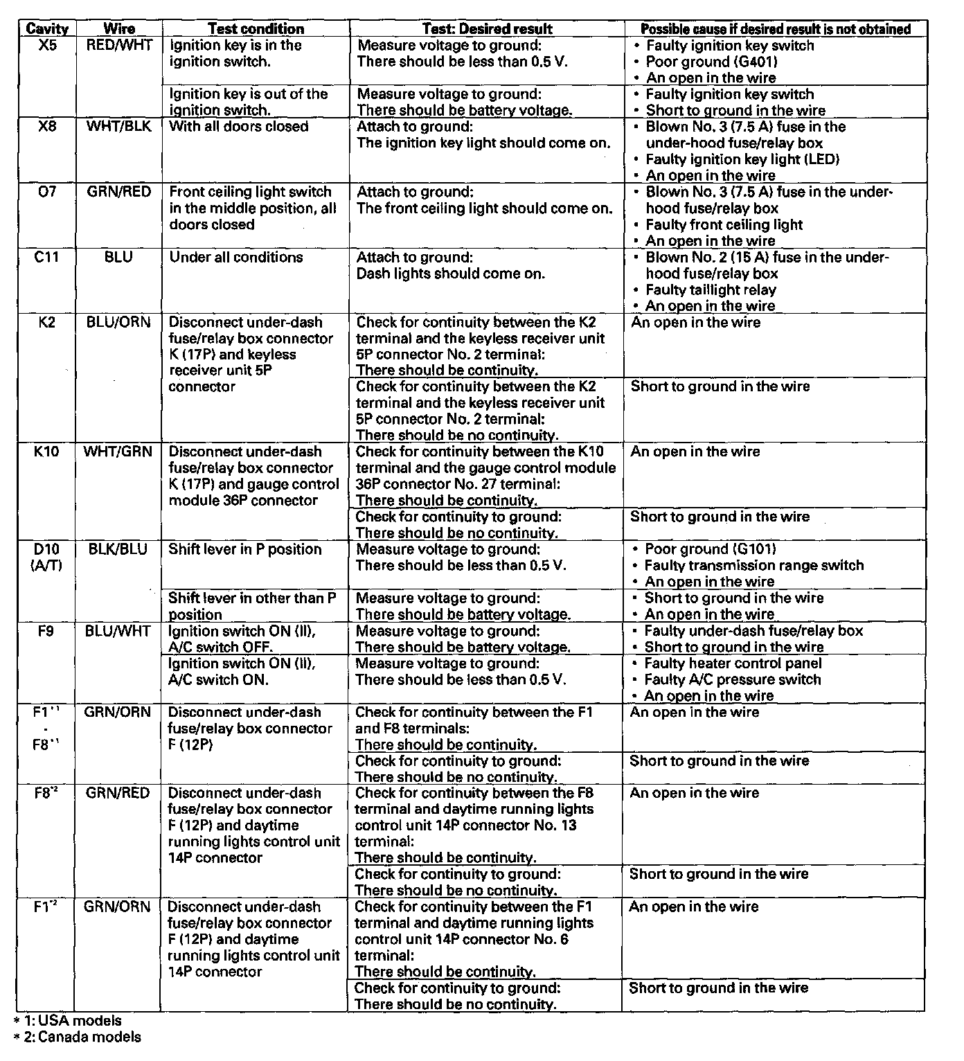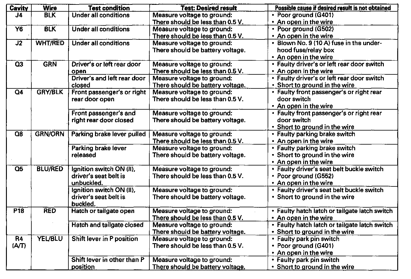 4. Reconnect the connectors to the under-dash fuse/relay box, and make these input tests at the appropriate connectors on the under-dash fuse/relay box.