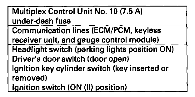 When the ignition switch is turned ON (II), the multiplex control unit, gauge control module, and ECM/PCM wake up at the same time without "talking" to each other through the communication lines. When any switch in the multiplex system is turned on, it wakes up its related control unit which, in turn, wakes up the other units.