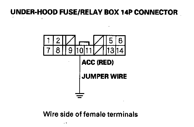 9. Momentarily connect under-hood fuse/relay box 14P connector terminal No. 10 to body ground with a jumper wire several times.