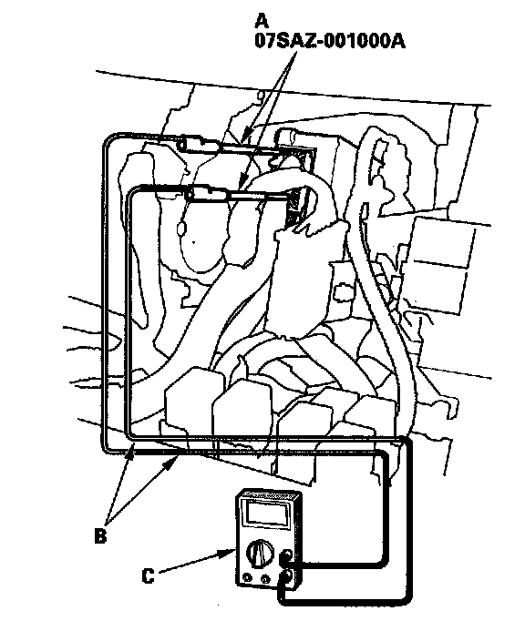 1. Connect the backprobe adapters (A) to the stacking patch cords (B), and connect the cords to a digital multimeter (C).