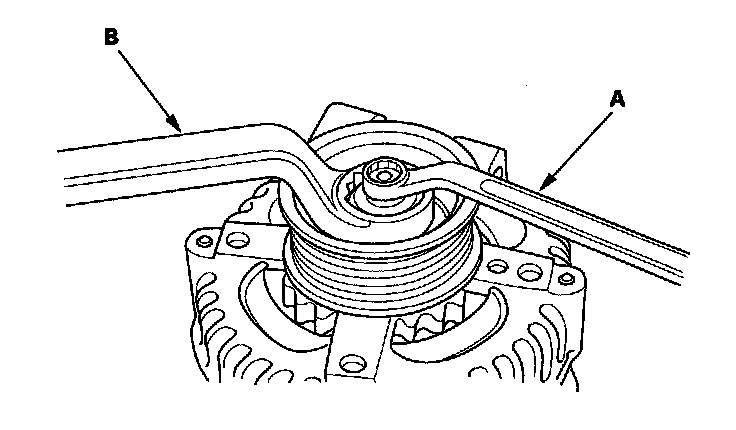3. If the front bearing needs replacing, remove the pulley locknut with a 10 mm wrench (A) and a 22 mm wrench (B). If necessary, use an impact wrench.