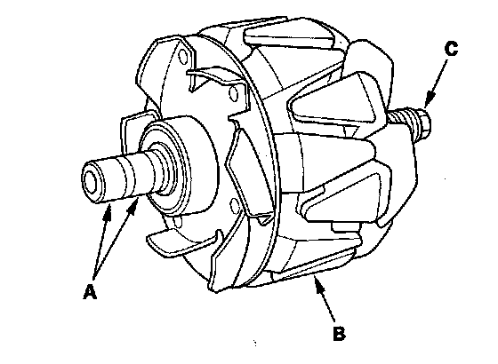 15. Check for continuity between each slip ring and the rotor (B) and the rotor shaft (C).