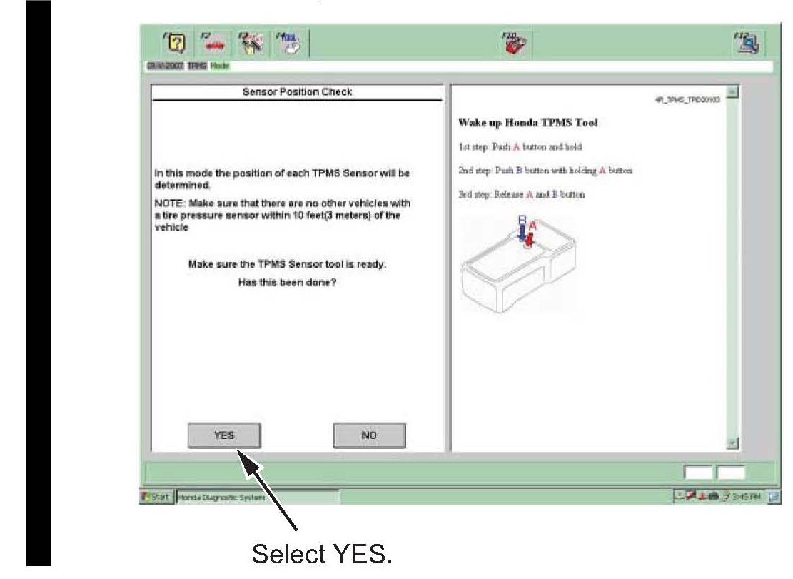 *10. On the Sensor Position Check screen, turn on the TPMS sensor tool by following the on-screen instructions. (The Accord is shown on the sample screen.)*