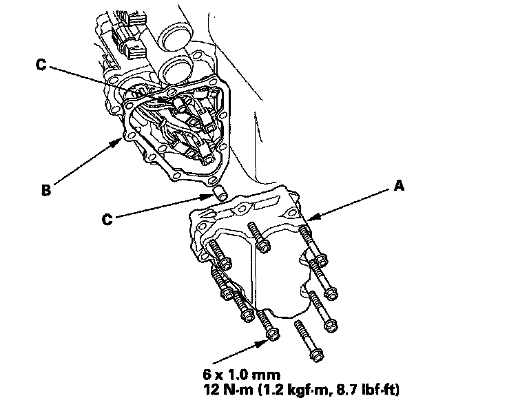 5. Remove the shift solenoid valve cover (A), gasket (B), and dowel pins (C).