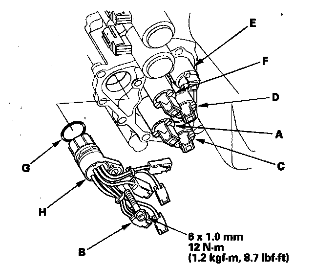 12. Install the new O-ring (G) on the shift solenoid harness connector (H), and install the connector in the transmission housing.