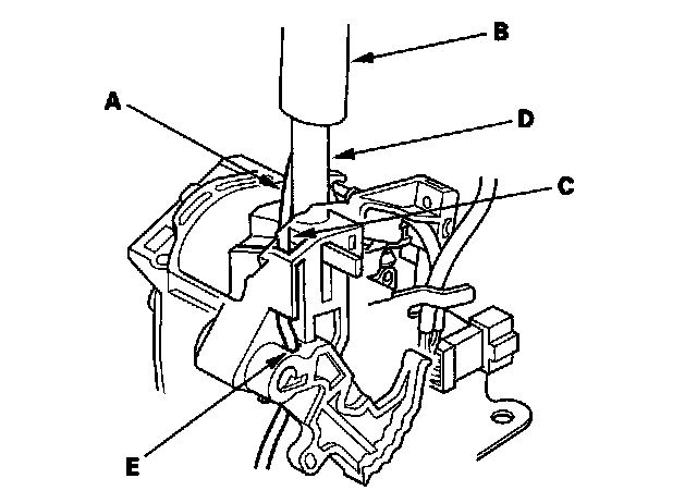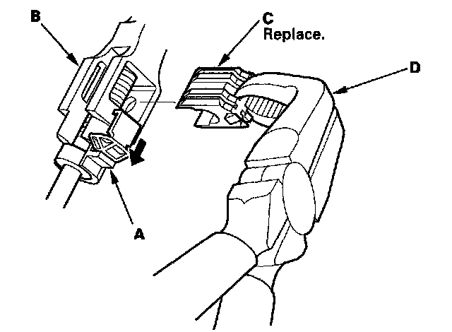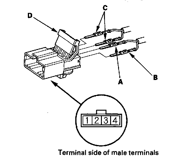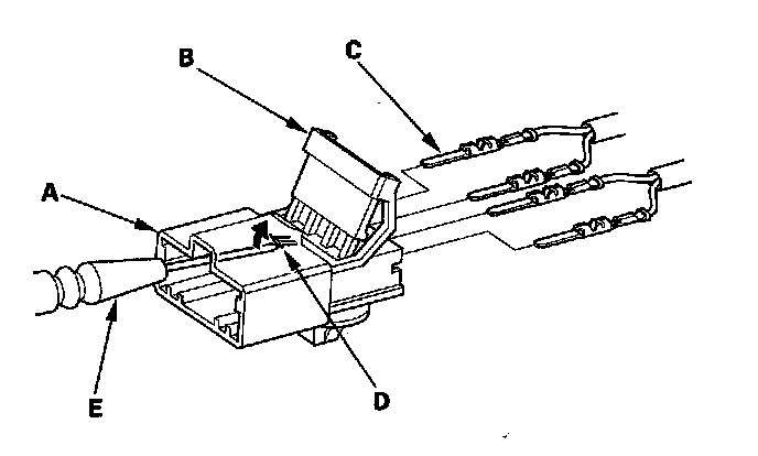 19. Remove the terminal (C) from the connector by pushing the lock tab (D) up in the connector using a thin blade screwdriver (E). Remove all four terminals.