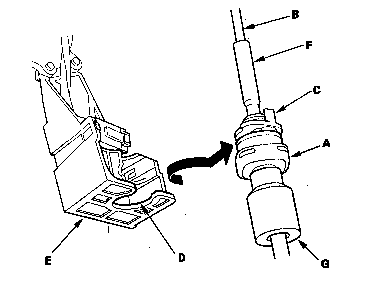 8. Rotate the socket holder (A) on the shift cable (B) a quarter turn; the tab (C) on the socket holder will be in the opening (D) of the shift cable bracket (E). Then slide the holder to remove the shift cable from the shift cable bracket. Do not remove the shift cable by twisting the shift cable guide (F) and damper (G).