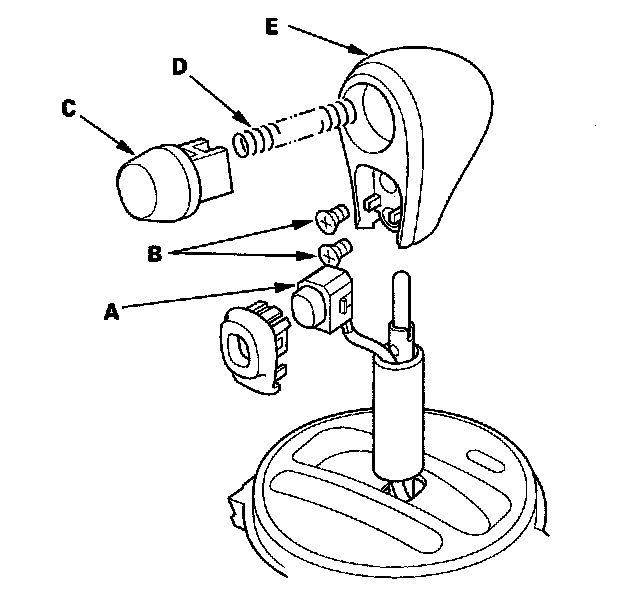 16. Remove the D3 switch (A) by expanding its locks, and remove the screws (B), shift lever button (C), spring (D), and shift lever knob (E).