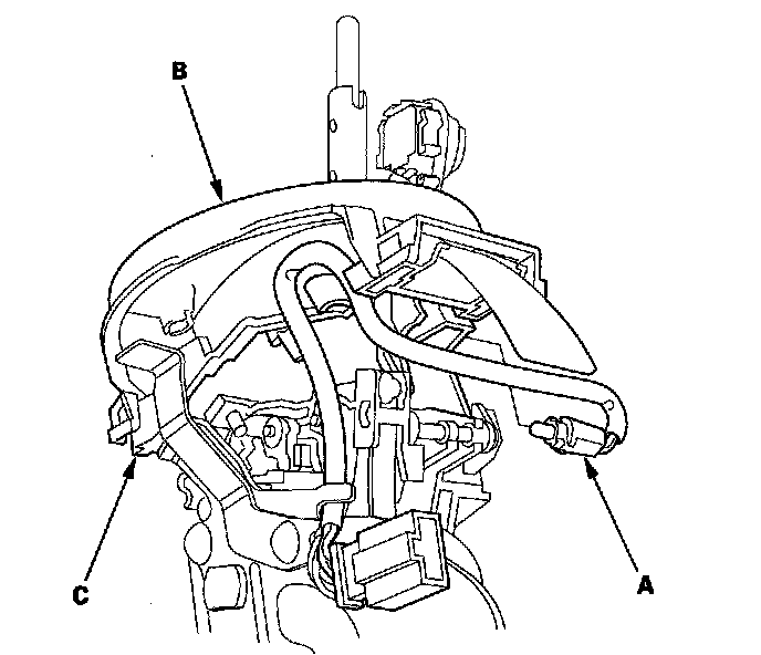 17. Remove the A/T gear position indicator panel light socket (A), then separate the A/T gear position indicator panel (B) from the shift lever bracket (C).