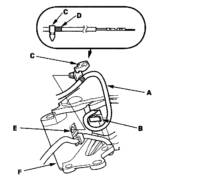 23. Install the harness clamp (C) at the reference tape (D) on the harness, then install the clamp in the hole (E) of the shift lever bracket (F).