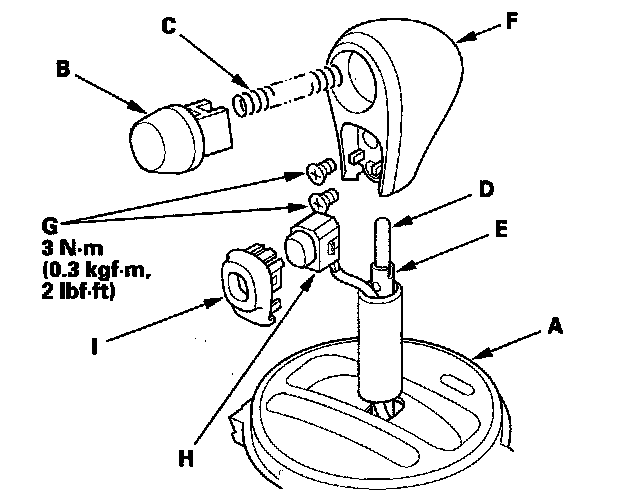 24. Install the A/T gear position indicator panel (A) on the shift lever bracket. Apply silicone grease to the shift lever button (B), spring (C), and push rod (D) of the shift lever (E), and install the spring, shift lever button, and shift lever knob (F). Apply non hardening thread lock sealant to screws (G), and secure the shift lever knob to the shift lever.