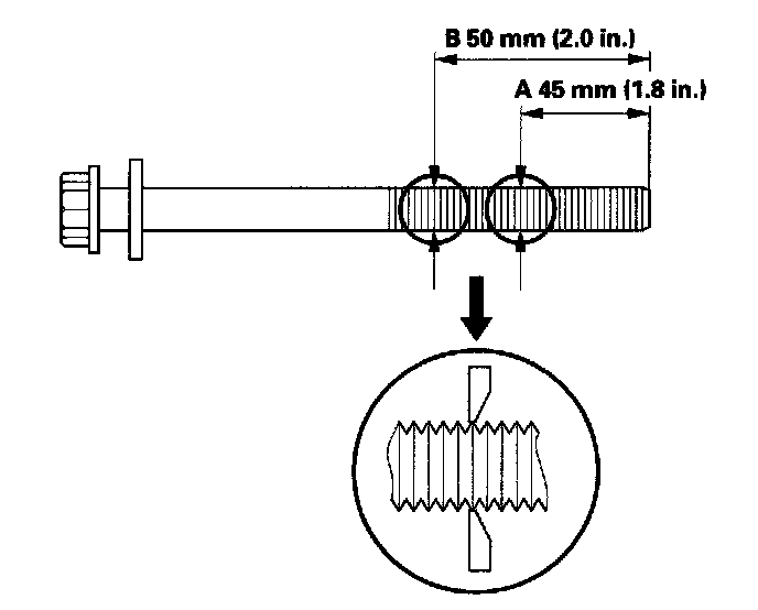 If either diameter is less than 10.6 mm (0.42 in.), replace the cylinder head bolt.