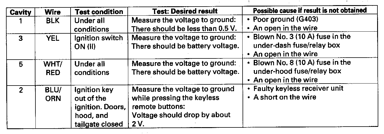 5. Reconnect the connector to the keyless receiver unit, and make these input tests at the connector.
