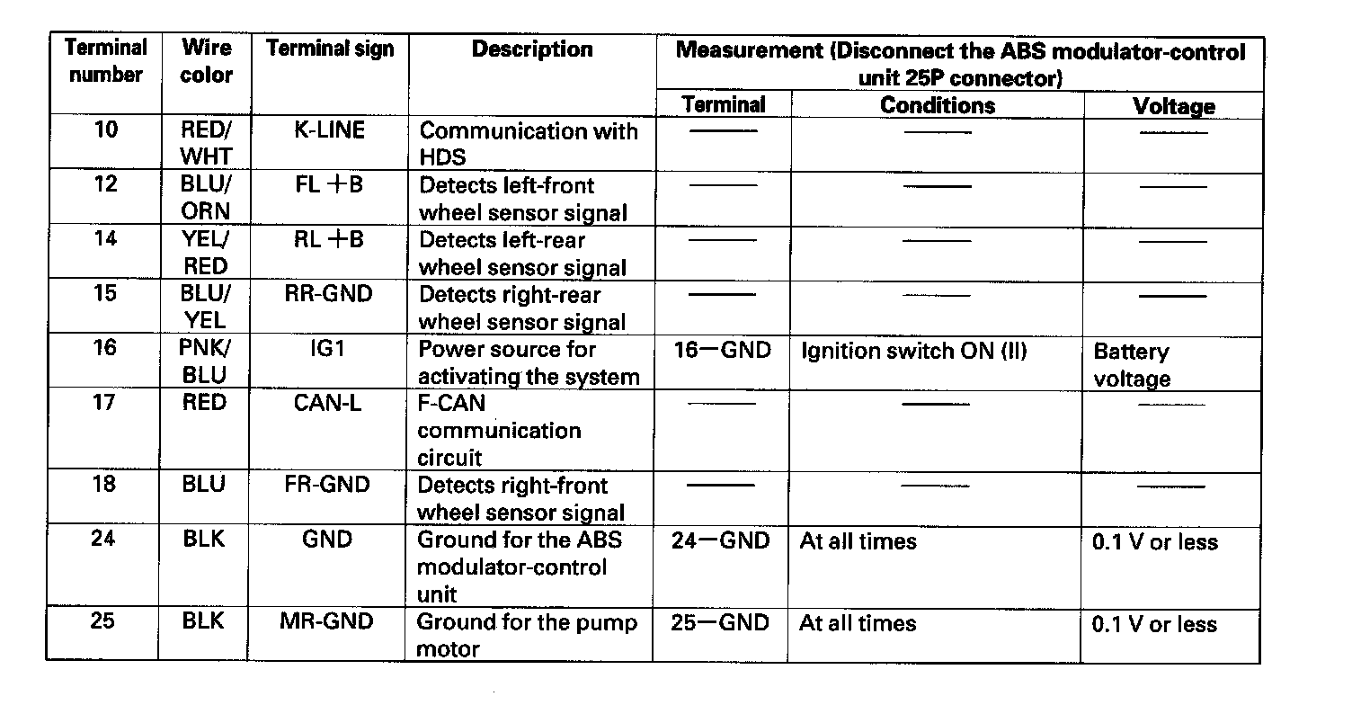 ABS Modulator-Control Unit Inputs And Outputs For 25P Connector (Part 1):