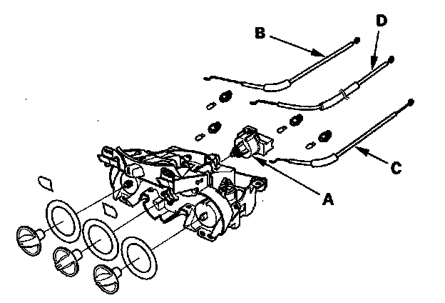 2. Remove the heater fan switch (A), the air mix control cable (B), the mode control cable (C), and the recirculation control cable (D).