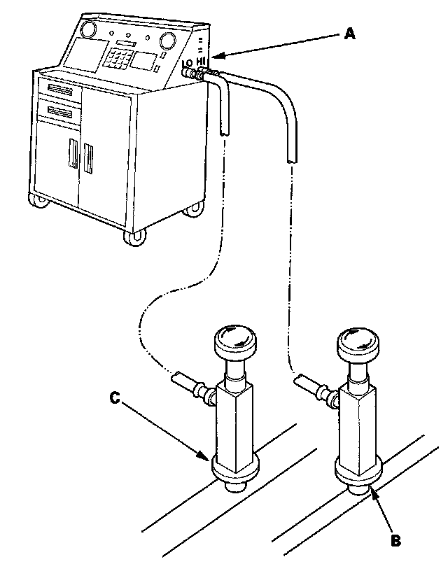 1. Connect an R-134a refrigerant recovery/recycling/charging station (A) to the high-pressure service port (B) and the low-pressure service port (C), as shown, following the equipment manufacturer's instructions.
