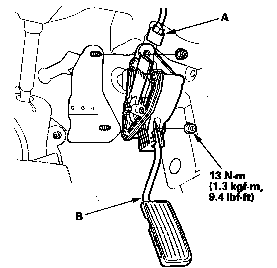 2. Remove the accelerator pedal module (B).