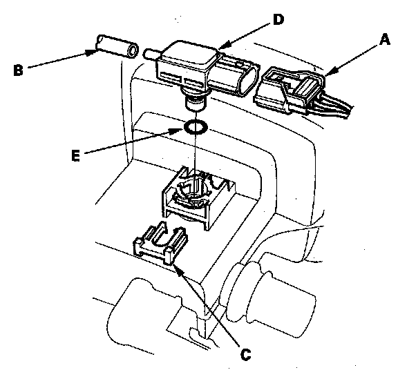 3. Disconnect the hose (B), remove the retainer (C), and remove the FTP sensor (D).
