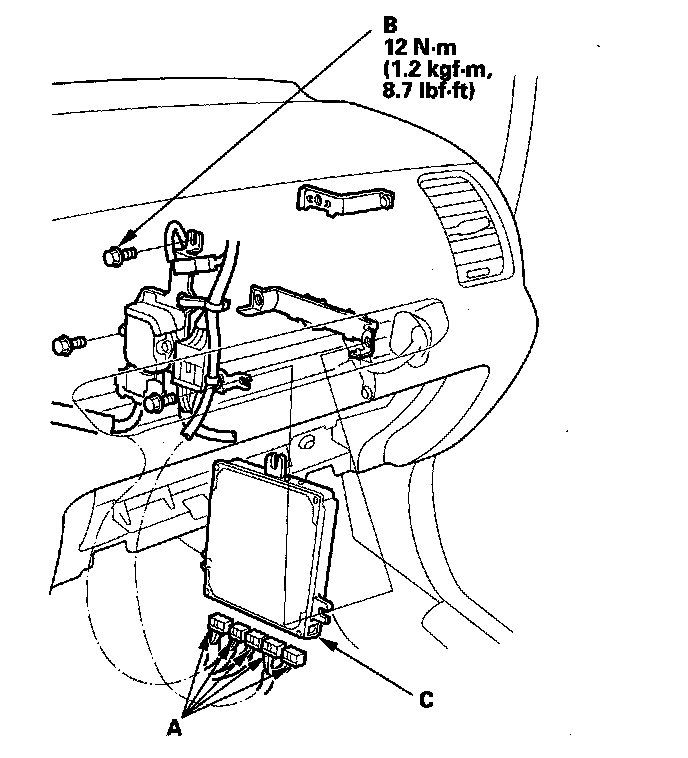 8. Disconnect the connectors (A), and remove the bolts (B), then remove the PCM (C).