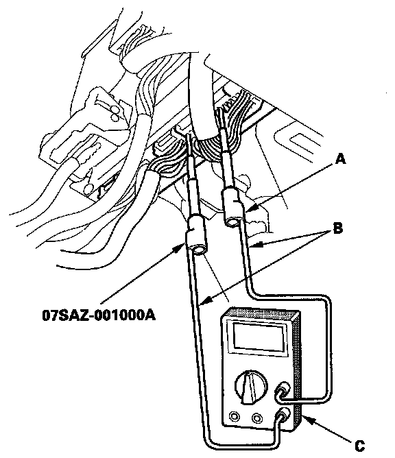 1. Connect the backprobe adapters (A) to the stacking patch cords (B), and connect the cords to a digital multimeter (C).