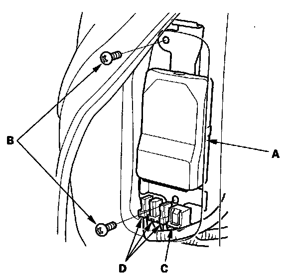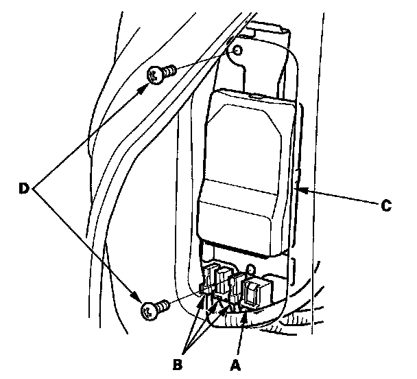 1. Place the new ODS unit (A) on the seat-back frame. Tighten the two screws (B), and connect the ODS unit harness 18P connector (C) and sensor connectors (D) to the ODS unit.