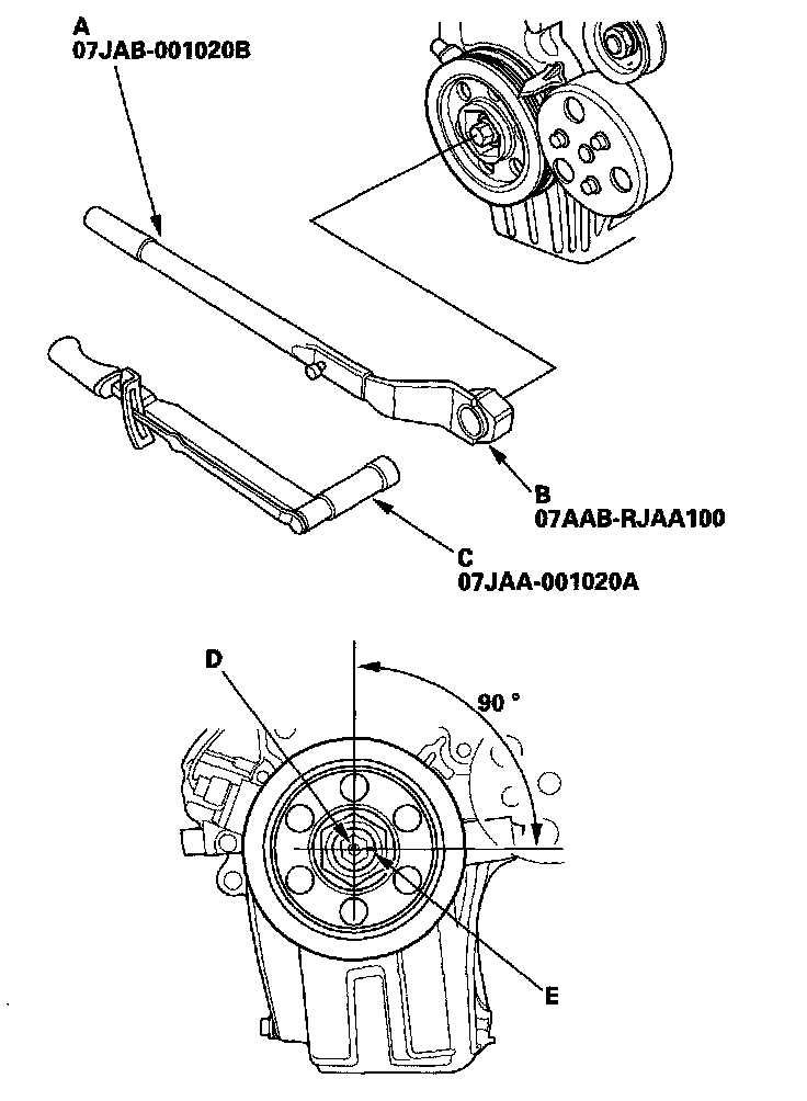 -2 Mark the bolt head (D) and the crankshaft pulley (E) as shown, then tighten the bolt an additional 90° (The mark on the bolt head should line up with the mark on the crankshaft pulley).
