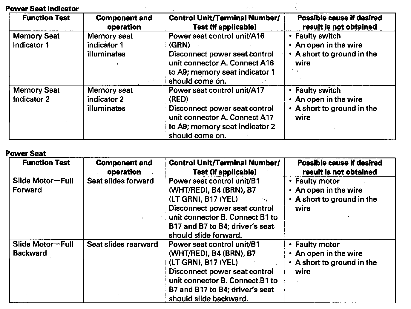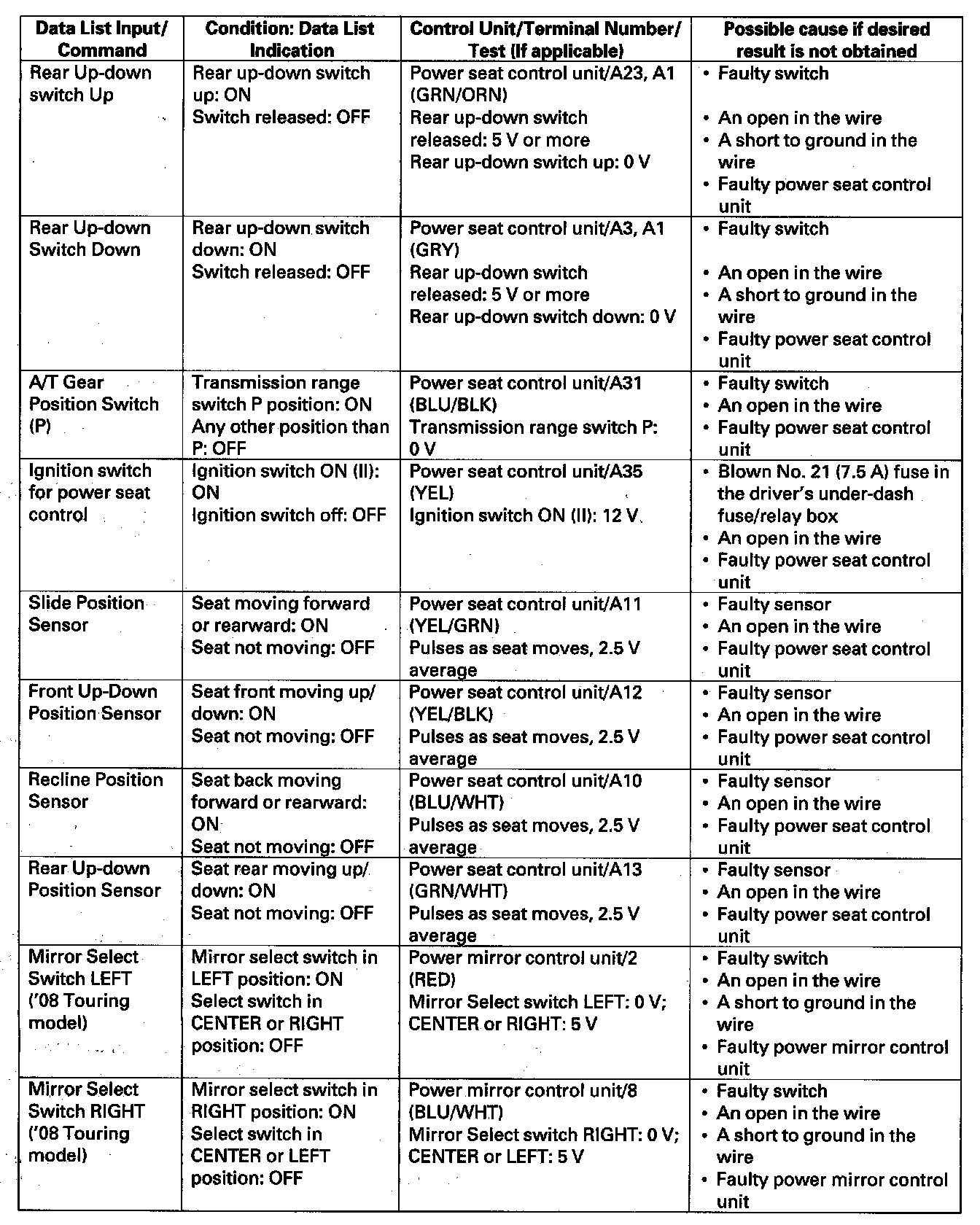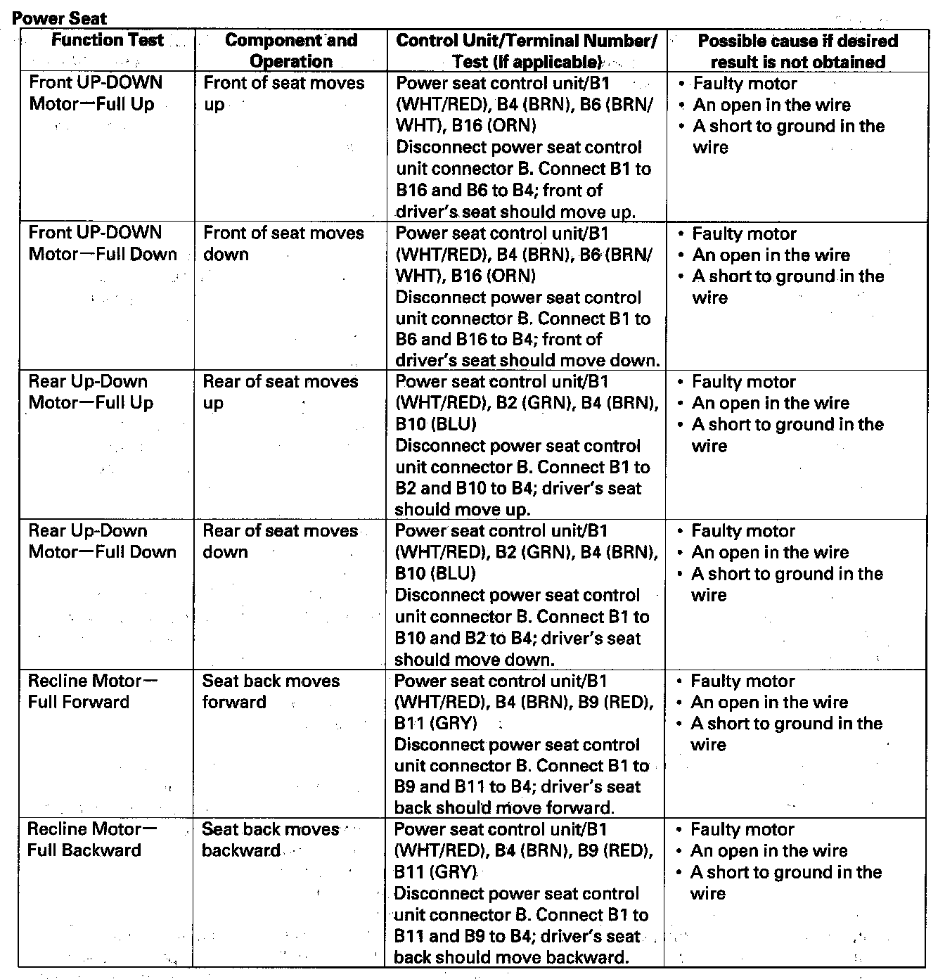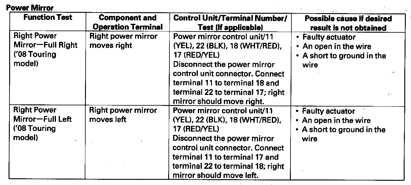- If the function does not operate normally, perform the appropriate test at the control unit and terminal indicated in the table.