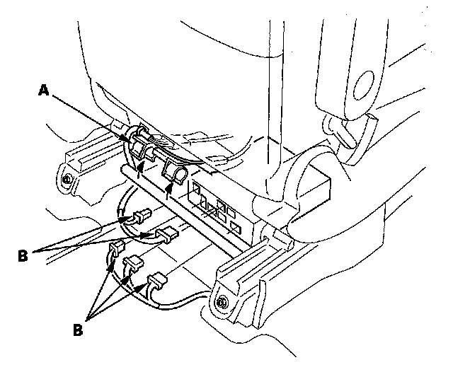 6. Lift up the rear of the seat connectors mounting clip (A), and disconnect the navigation unit connectors (B).
