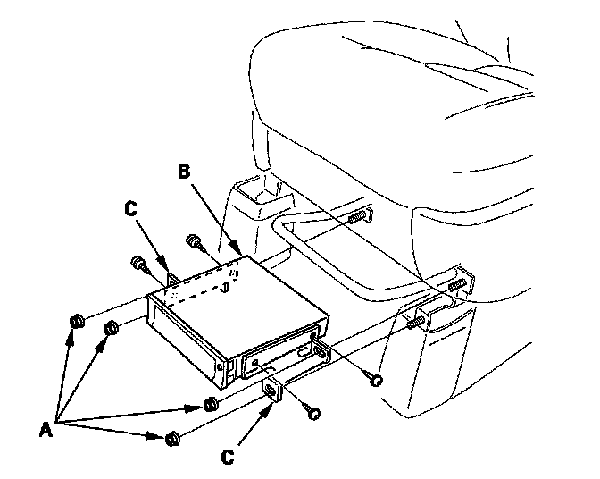 7. Move the driver's seat all the way back, and remove the four mounting nuts (A), then remove the navigation unit (B) with brackets (C) from the driver's seat.