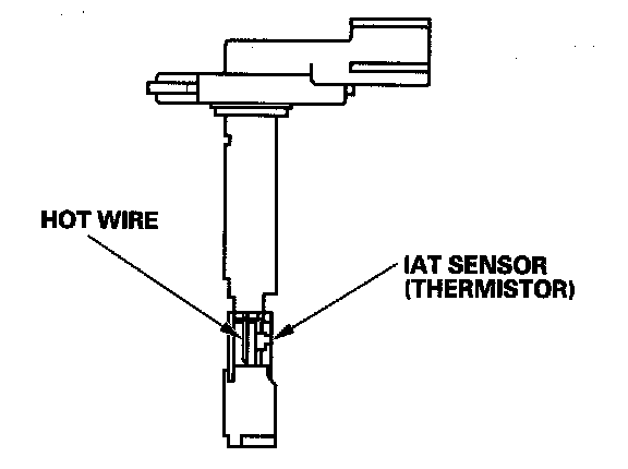Mass Air Flow (MAF) Sensor/Intake Air Temperature (IAT) Sensor (J35A7 engine ('08 model))The mass air flow (MAF) sensor/intake air temperature (IAT) sensor contains a hot wire and a thermistor. It is located in the intake air passage. The resistance of the hot wire and thermistor change due to intake air temperature and air flow. The control circuit in the MAF sensor controls the current to keep the hot wire at a set temperature. The current is converted to voltage in the control circuit, then output to the PCM.