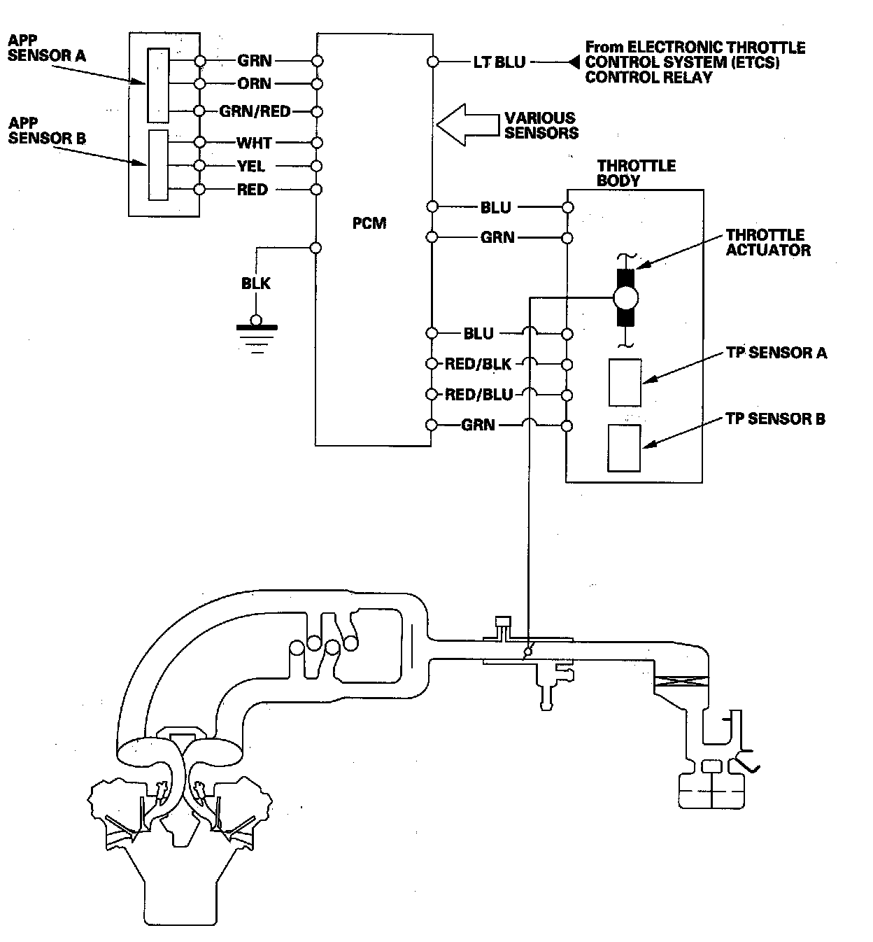 Electronic Throttle Control System DiagramThe electronic throttle control system consists of the throttle actuator, throttle position (TP) sensor A/B, accelerator pedal position (APP) sensor A/B, the electronic throttle control system (ETCS) control relay, and the PCM.