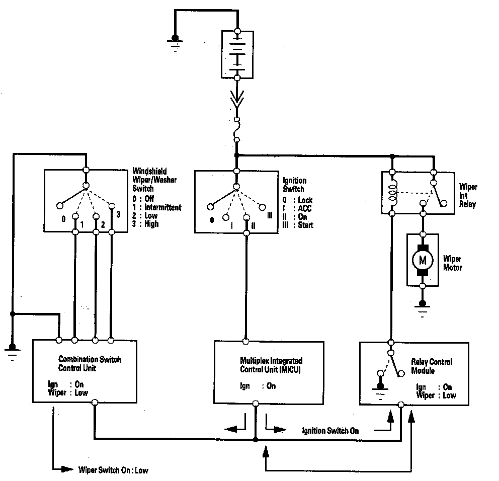 Messages are transmitted by an ECU (that monitors an input) over the communication circuit. ECUs that use the message (information related to that input) are the receivers. For example, the combination switch control unit monitors the wiper switch. When the wiper switch is placed in the low speed position, the combination switch control unit transmits that message on the communication circuit. The relay control module receives the message and turns on the wipers by providing a ground for the relay.
