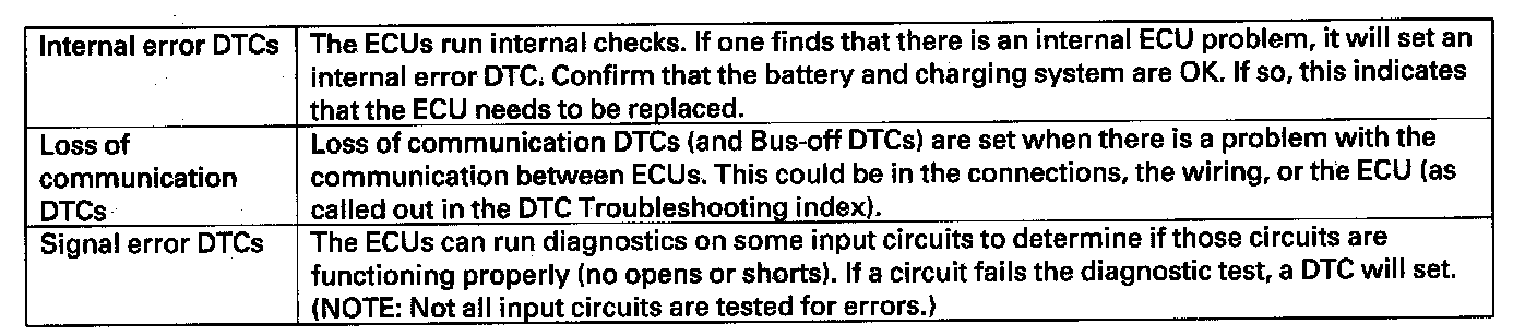 The B-CAN and the F-CAN send messages to each other to check the integrity of the network communication circuit. They do this by sending a specific digital message out after an event. For example, after turning the ignition switch to ON (II). All the ECUs on the communication circuit expect to receive a message from other specific units within a specified amount of time. If the message is not received, the ECU will transmit a DTC reporting that it did not receive the message.