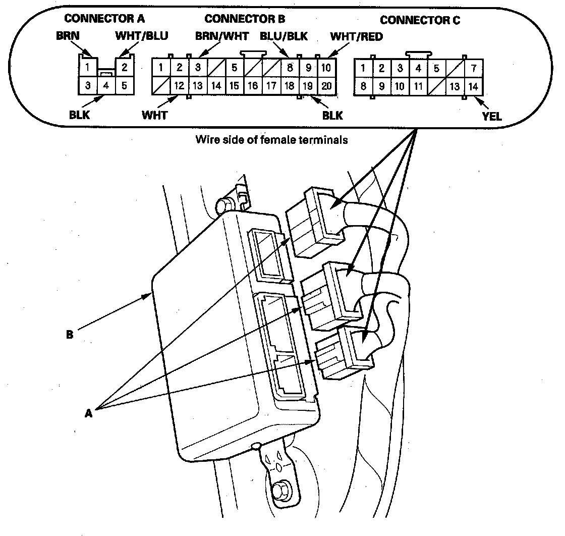 3. Disconnect the 20P, 14P, and 5P connectors (A) from the power tailgate control unit (B).