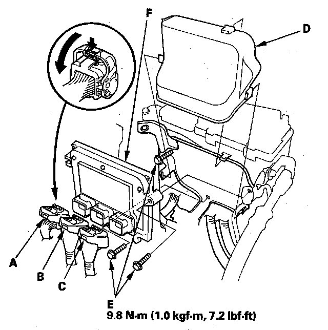 11. Loosen or remove the bolts (E), then remove the PCM (F).