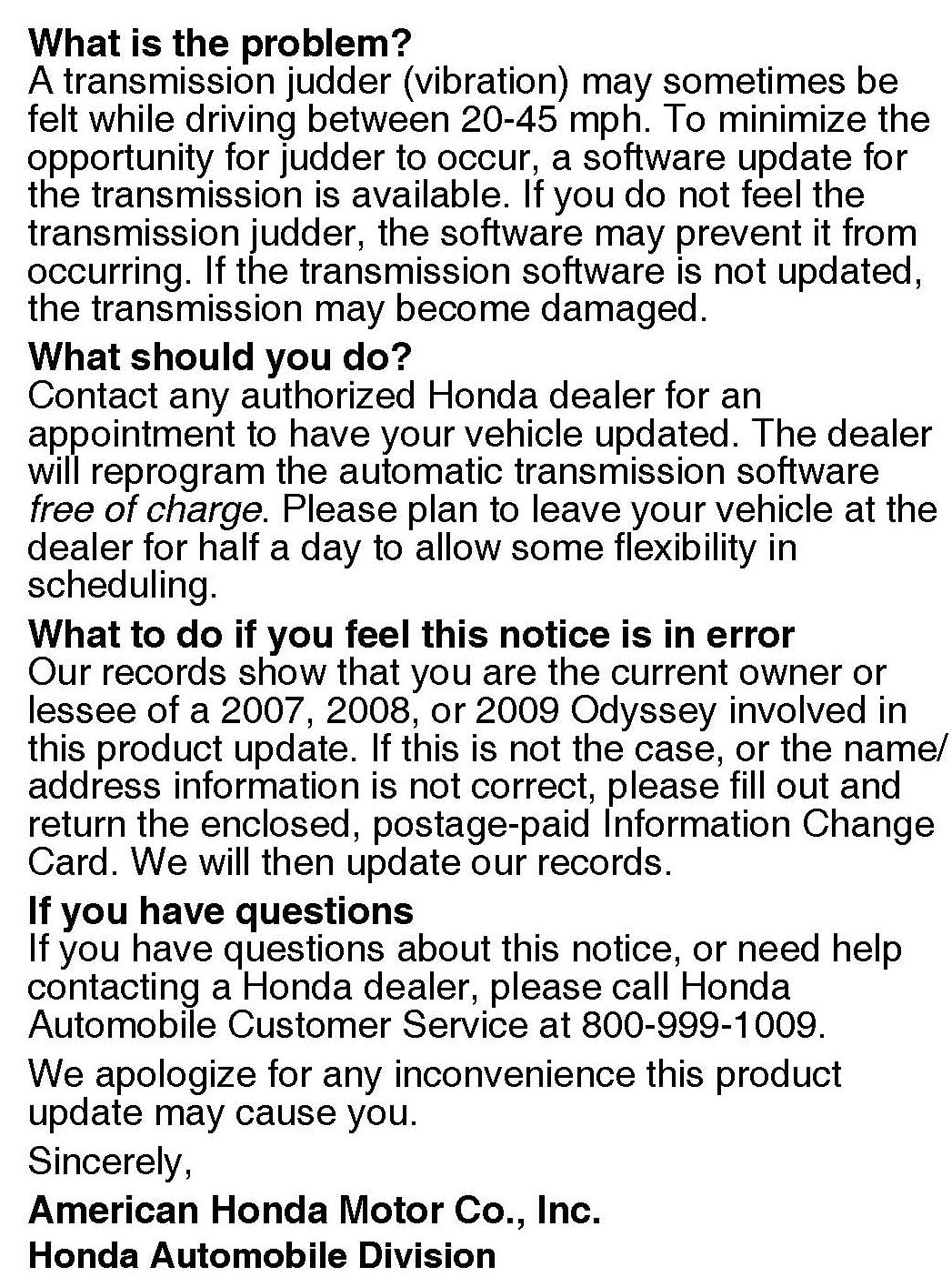 In May 2010, owners of 2007-08 and early 2009 Odysseys were sent a notification. Then, in September 2010, owners of late 2009 and some 2010 Odysseys were sent a notification. Examples of both customer notifications are at the end of this service bulletin.