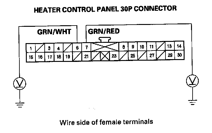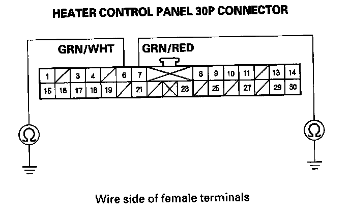 8. Check for continuity between the No. 6 and No. 7 terminals of the heater control panel 30P connector and body ground individually.