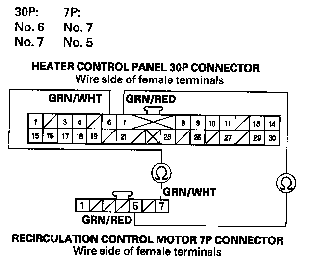 11. Check for continuity between the following terminals of the heater control panel 30P connector and the recirculation control motor 7P connector.