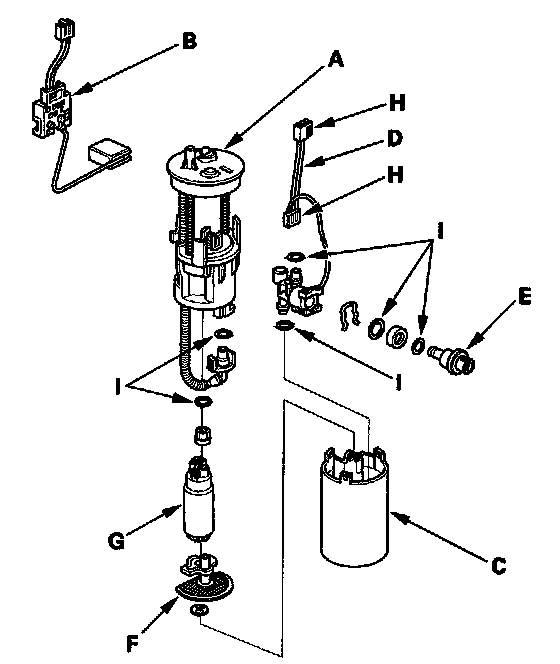 3. When connecting the fuel pump assembly, make sure the connection is secure and the suction filter (F) is firmly connected to the fuel pump (G).