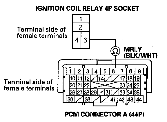 9. Check for continuity between ignition coil relay 4P socket terminal No. 3 and PCM connector terminal A6.