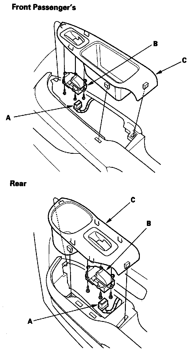2. Disconnect the 6P connector (A) from the power window switch (B), then remove the three mounting screws and the power window switch from the switch trim (C).