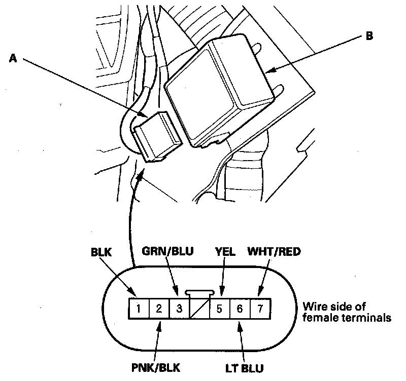 2. Disconnect the 7P connector (A) from the keyless receiver unit (B).