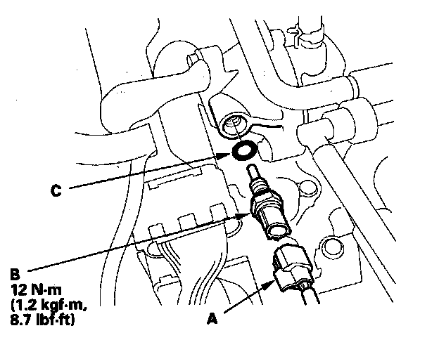 5. Install the parts in the reverse order of removal with a new O-ring (C), then refill the radiator with engine coolant, and bleed air from the cooling system with the heater valve open.