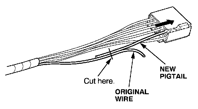 6. Lay the pigtail and the original wire side-by-side, and cut off both ends at once. If you are making more than one splice, do not cut each pigtail at the same location; the resulting "lump" of splice connectors would interfere with rewrapping the harness. Instead, cut the first pigtail close enough to the terminal so you will have room to make each remaining cut about 20 mm (3/4 inch) farther down on the next pigtail.