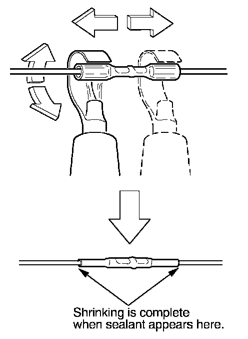 13. Plug in the heat gun, and turn it on. Start at the middle of the splice connector, and move the gun toward the ends as the tube shrinks. Apply heat evenly by rotating the curved heat spreader around the splice connector. Shrinking is complete when a small amount of sealant appears at each end of the tube.