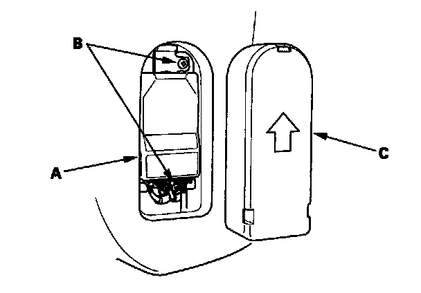 1. Place the new ODS unit (A) on the seat-back frame. Tighten the three screws (B), and connect the ODS harness 18P connector and sensor connectors to the ODS unit. Reinstall the cover (C).