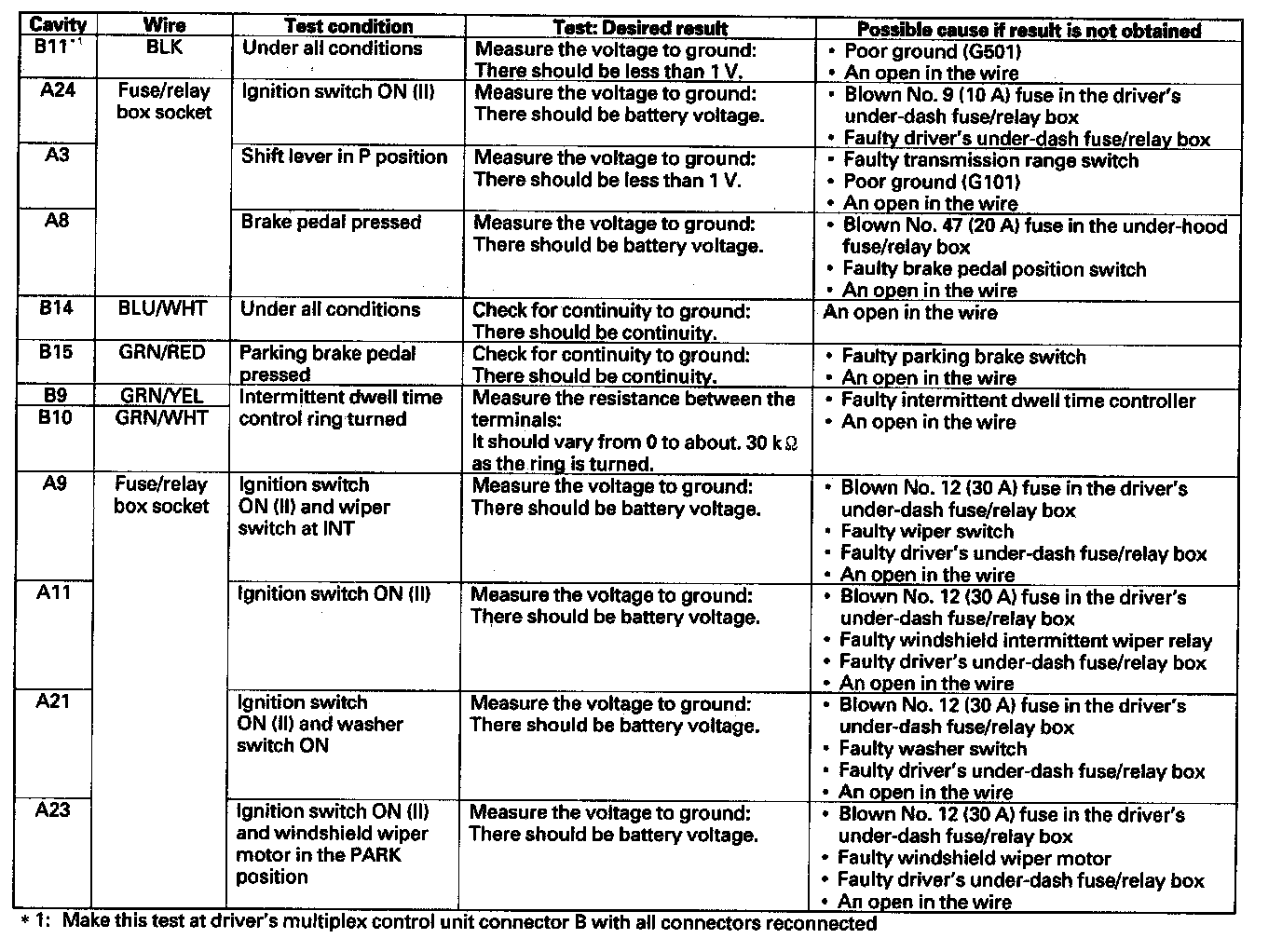 1. Before testing the wiper/washer control functions, troubleshoot the multiplex control system. Multiplex Control Unit Input Test