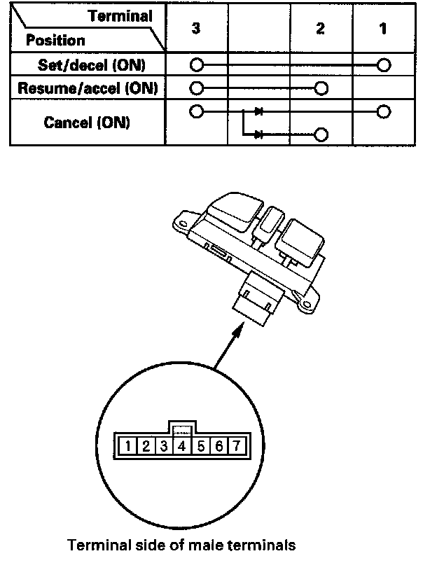 - If there is continuity, and it matches the table, but switch failure occurred on the cruise control input test, check and repair the wire harness on the switch circuit.