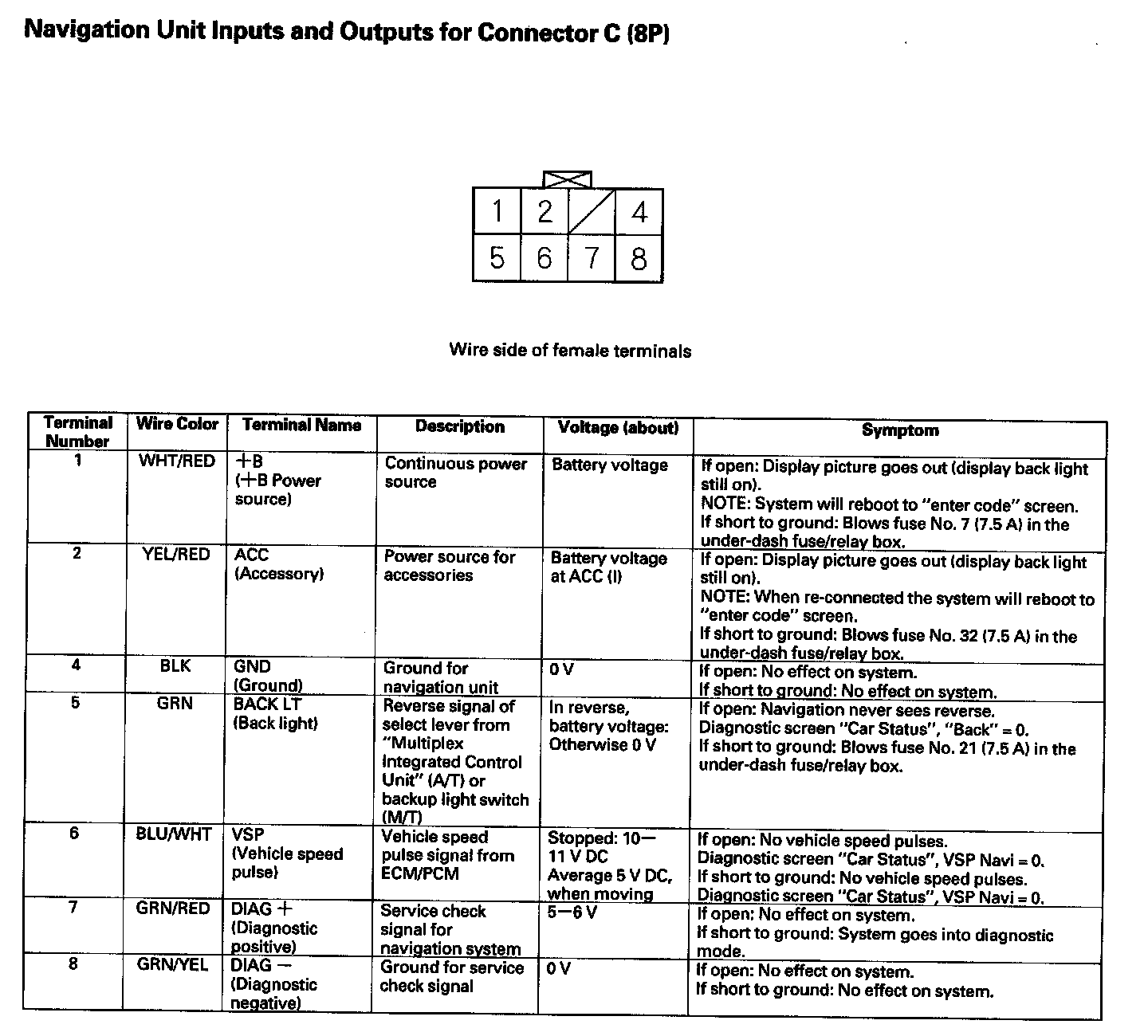 Navigation Unit Inputs And Outputs For Connector C (8P):
