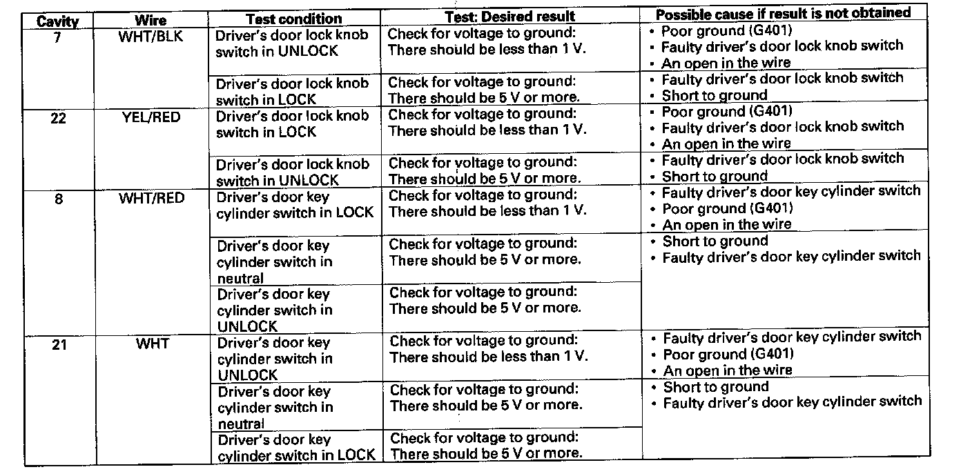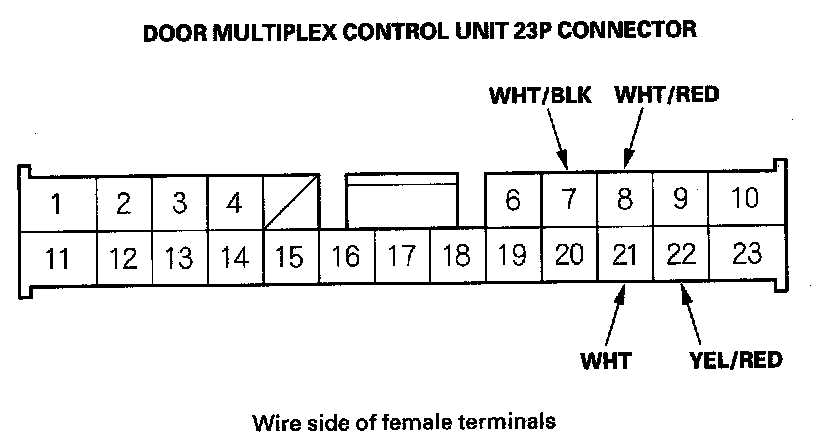 11. Reconnect the connector to the door multiplex control unit. Turn the ignition switch ON (II), and make these input tests at the appropriate connector.